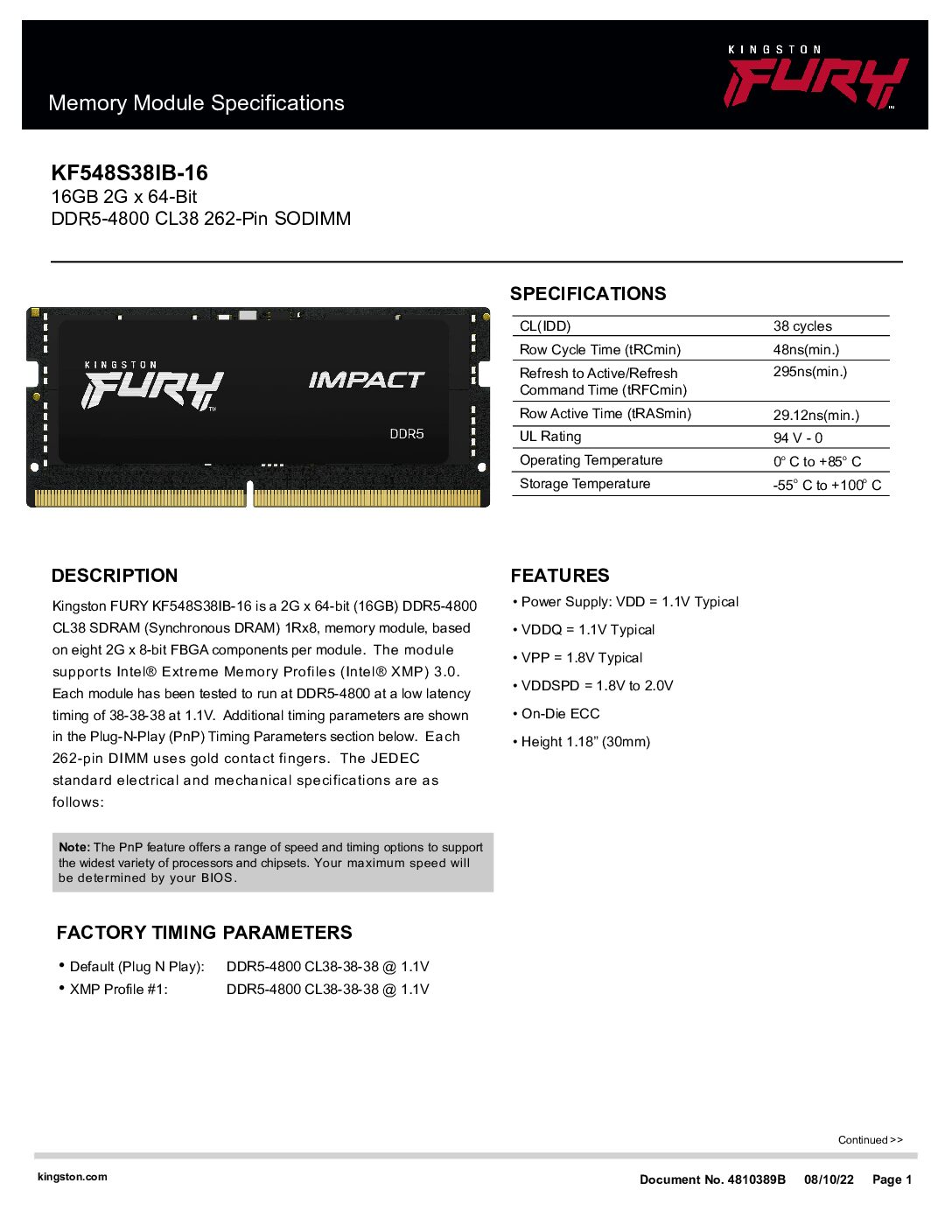 MEMORIA SODIMM DDR5 FURY IMPACT 16GB 4800MHZ CL38 PNP(KF548S38IB-16)